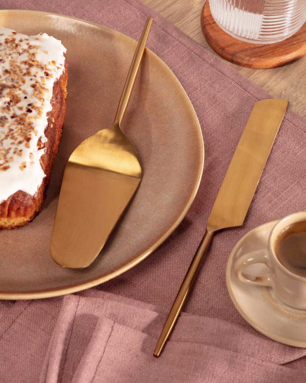Su diseño elegante y sereno aporta un toque festivo sin perder sobriedad, y convierte cualquier postre en un gesto más cuidado. Es un set práctico y funcional, perfecto para cortar, servir y disfrutar cada porción con calma. Para mantener su brillo intacto, basta con lavarlo a mano.