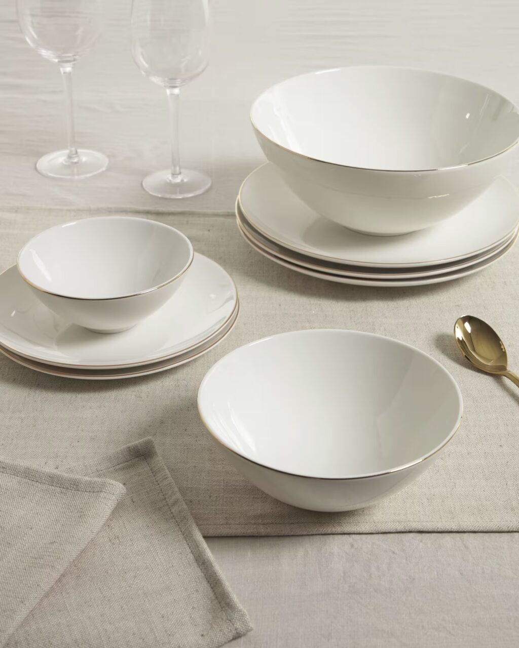 Taisia, elaborada en porcelana blanca y rematada con un sutil perfil dorado, es una pieza que aporta elegancia a la mesa sin esfuerzo. Su diseño invita a usarla en esos encuentros especiales que llegan con la Navidad, aunque su estética atemporal hace que también se disfrute el resto del año. Además, es apta para lavavajillas, un detalle práctico que siempre agradecemos en días de celebraciones.