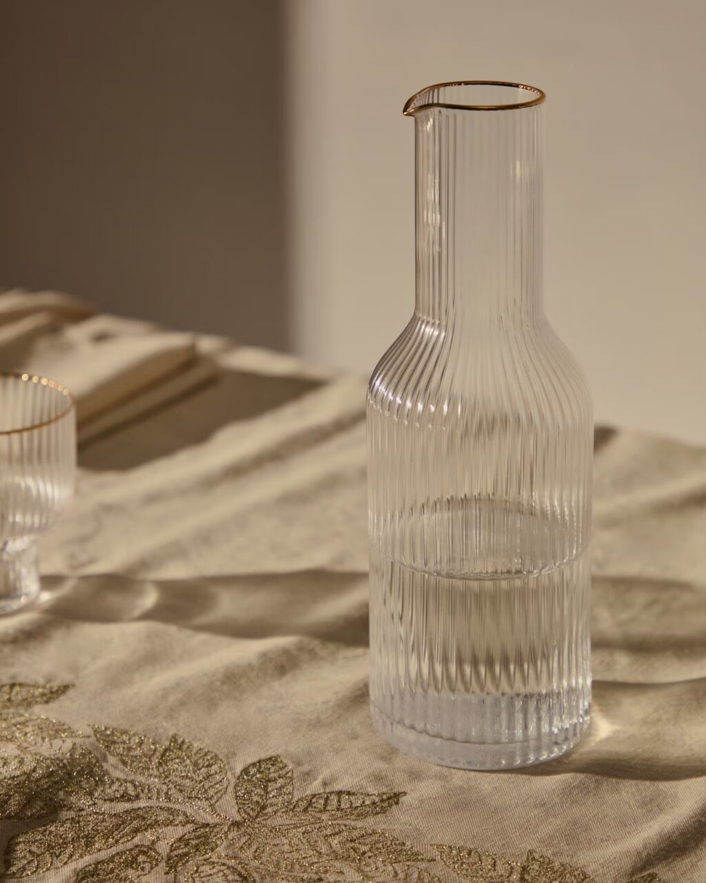 La jarra Ayan es una de esas piezas que elevan la mesa sin necesidad de grandes gestos. Fabricada en vidrio transparente y rematada con un delicado borde dorado, aporta un toque de elegancia discreta que encaja tanto en las comidas cotidianas como en las celebraciones especiales. Con una capacidad de 115 cl, es perfecta para servir agua, limonadas caseras o cualquier bebida que acompañe la velada.