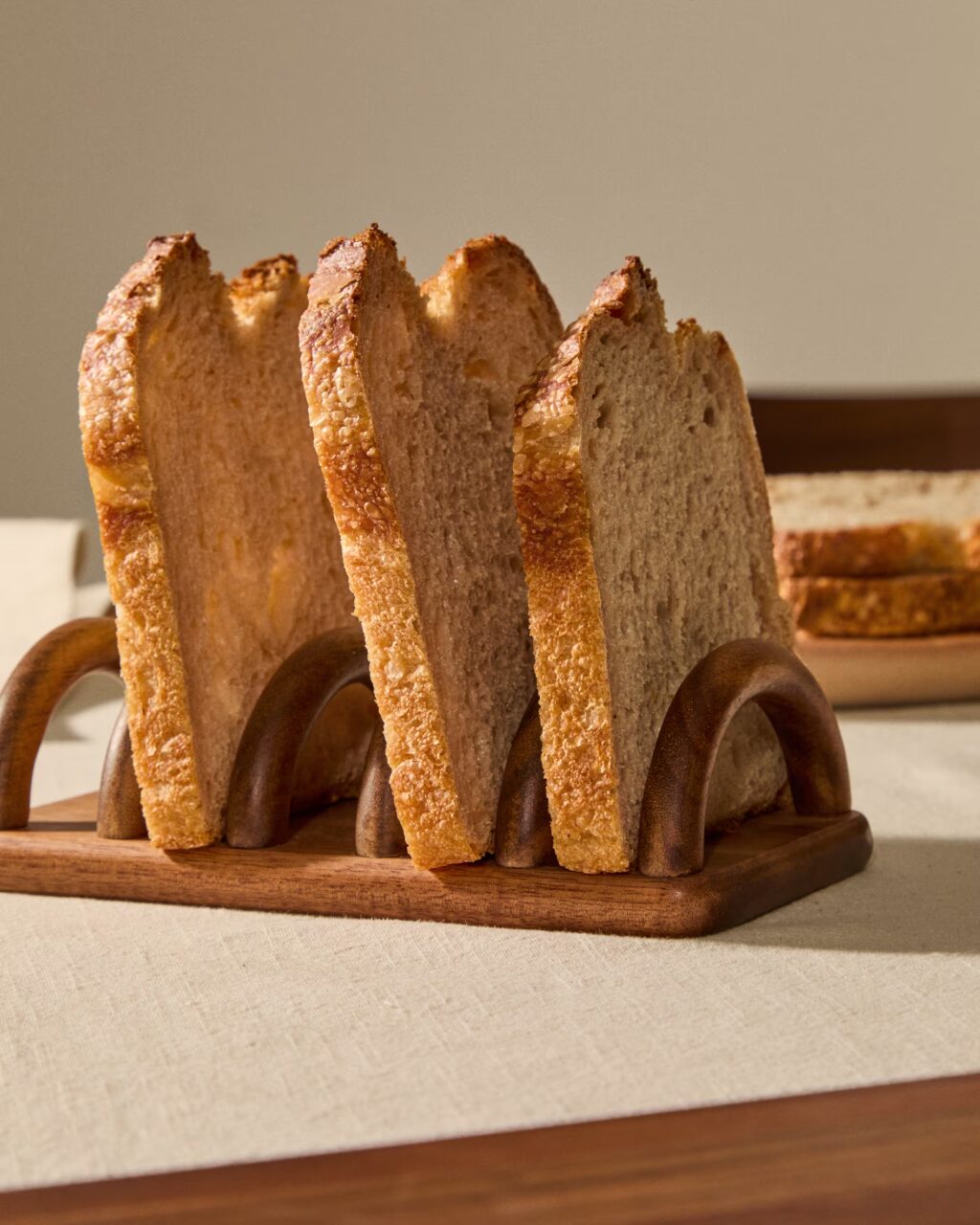 El soporte para tostadas Nukha, elaborado en madera maciza de acacia, es una pieza pensada para realzar ese momento. Cada unidad es única, con vetas y tonalidades propias que reflejan la belleza natural de la madera. Su diseño, de formas redondeadas y tacto suave, combina funcionalidad y elegancia, aportando calidez a la encimera y convirtiendo un gesto sencillo en un pequeño ritual.