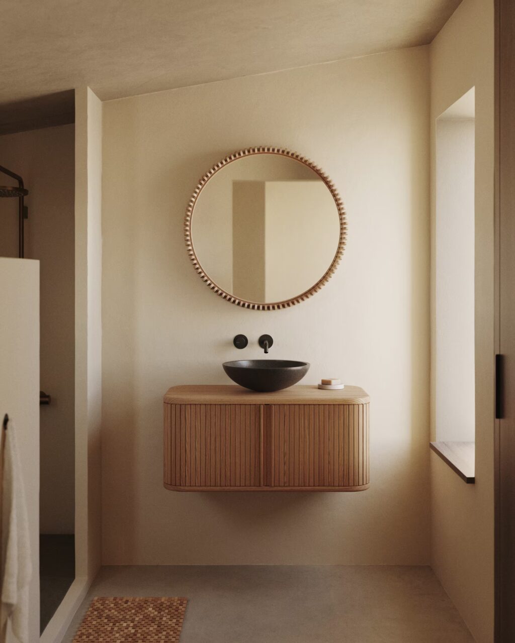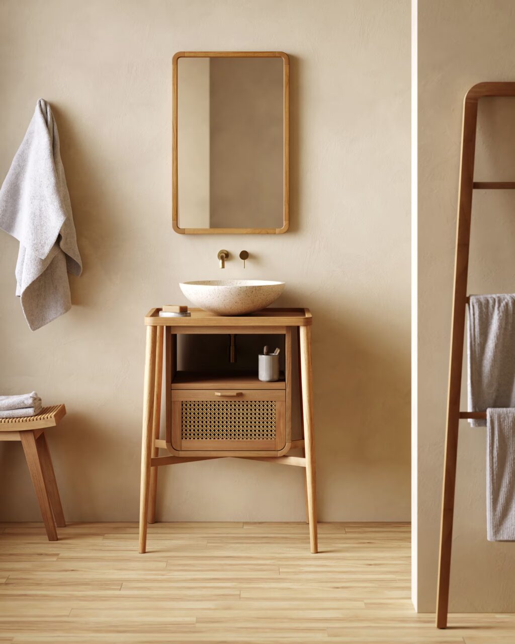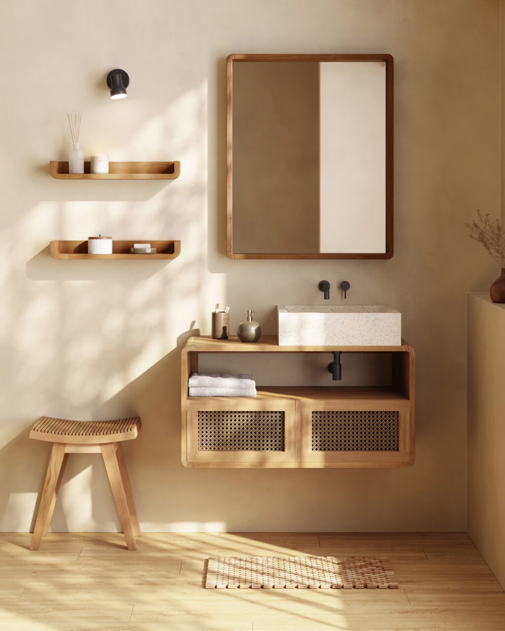 El baño puede ser una extensión del dormitorio si mantiene el mismo lenguaje visual: materiales naturales, líneas ligeras y tonos suaves. En este diseño, la madera se convierte en la gran protagonista. El mueble con estructura ligera y puerta de rejilla combina lo artesanal con lo funcional, aportando una textura visual que conecta con la luz y con el suelo de lamas.