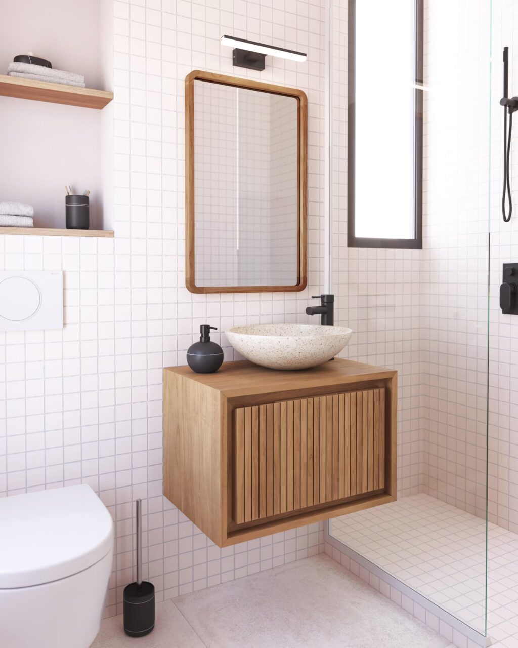 Un baño pequeño no tiene por qué ser neutro. Este espacio demuestra que los materiales pueden marcar la diferencia. El revestimiento de pequeñas baldosas cuadradas aporta textura y luminosidad, mientras el mueble en madera clara introduce la calidez necesaria para equilibrar el conjunto.