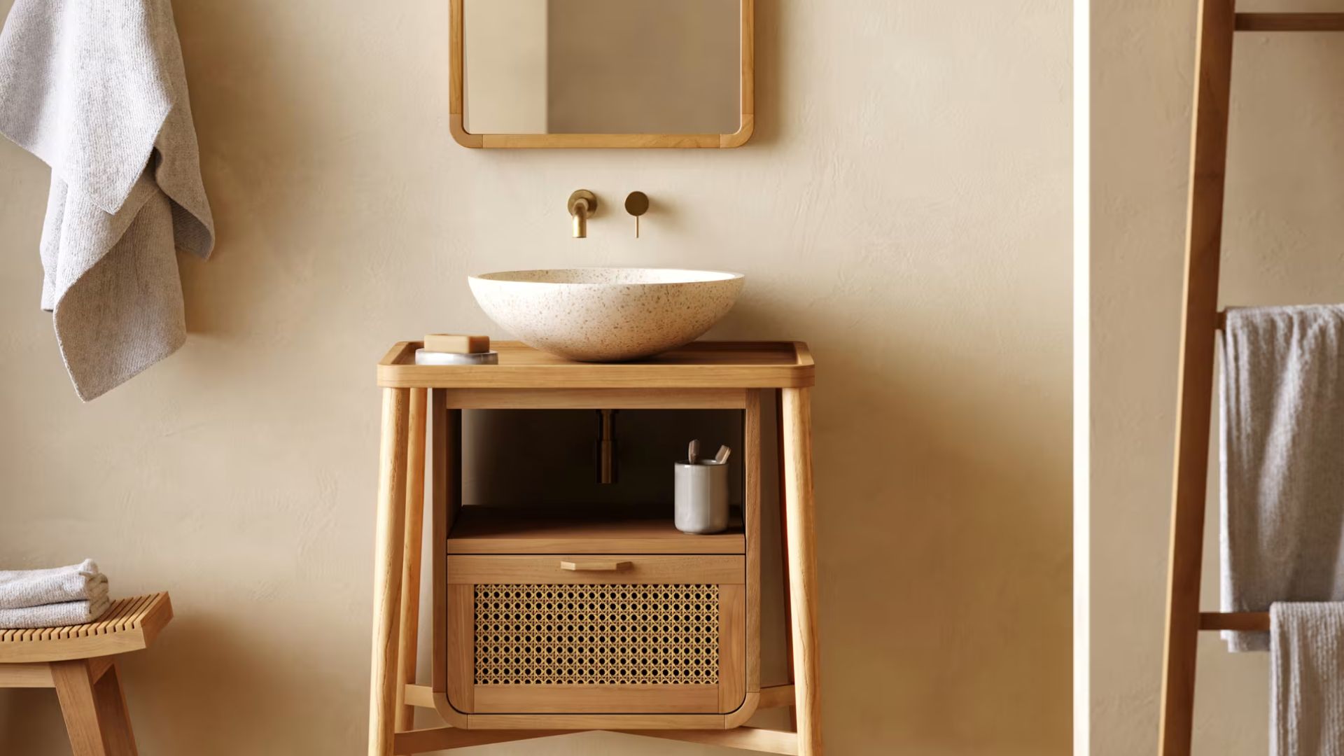 El baño puede ser una extensión del dormitorio si mantiene el mismo lenguaje visual: materiales naturales, líneas ligeras y tonos suaves. En este diseño, la madera se convierte en la gran protagonista. El mueble con estructura ligera y puerta de rejilla combina lo artesanal con lo funcional, aportando una textura visual que conecta con la luz y con el suelo de lamas.