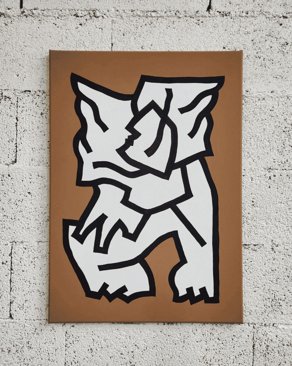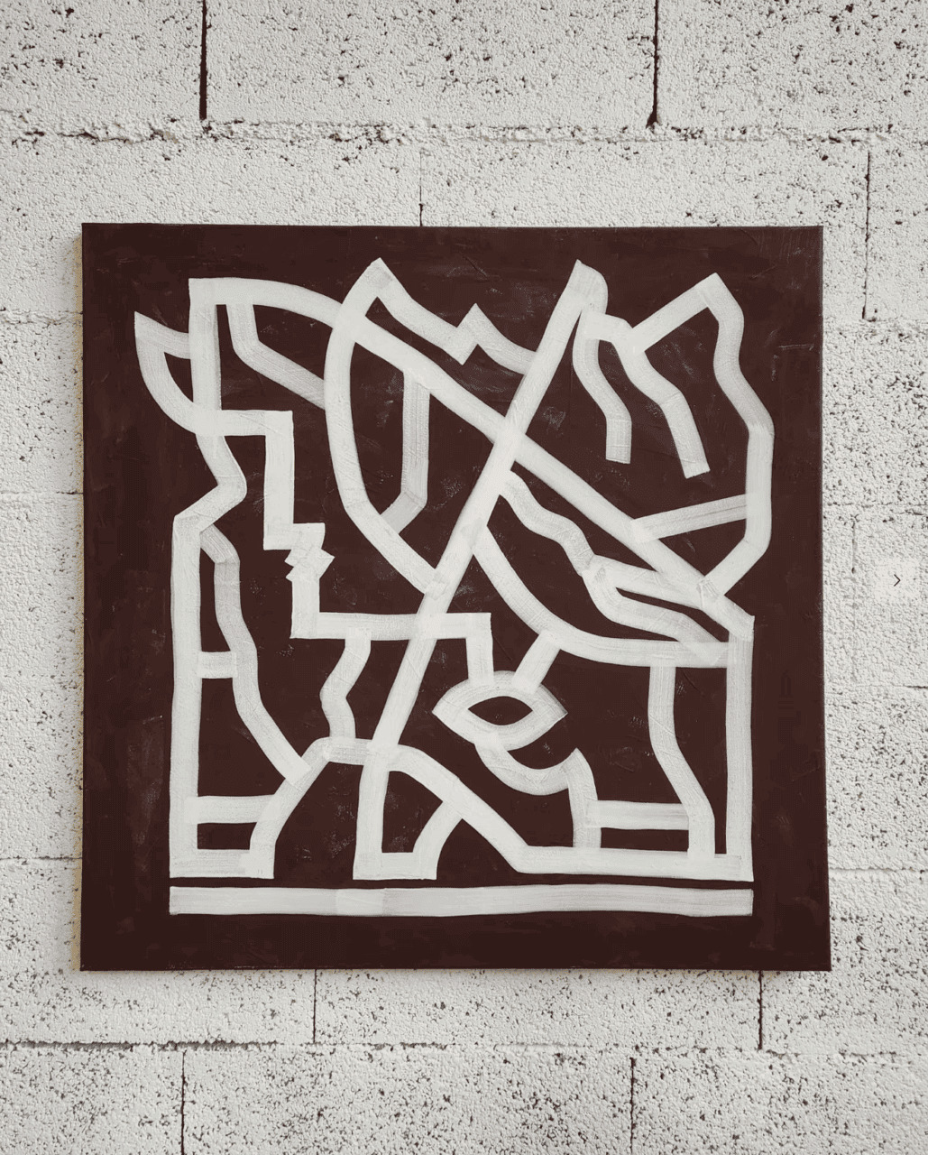 En sus series, disponible por un tiempo en Kave Gallery, esta dualidad entre control y espontaneidad se hacía evidente. El artista presentó tres conjuntos de pinturas: «La primera son personajes sobre fondo marrón, que me gustan mucho porque transmiten movimiento. Luego están los tótems azules y otras dos obras también en marrón, que son como instantáneas, composiciones simples con mi estilo gráfico que ganan complejidad con las transparencias y las capas».