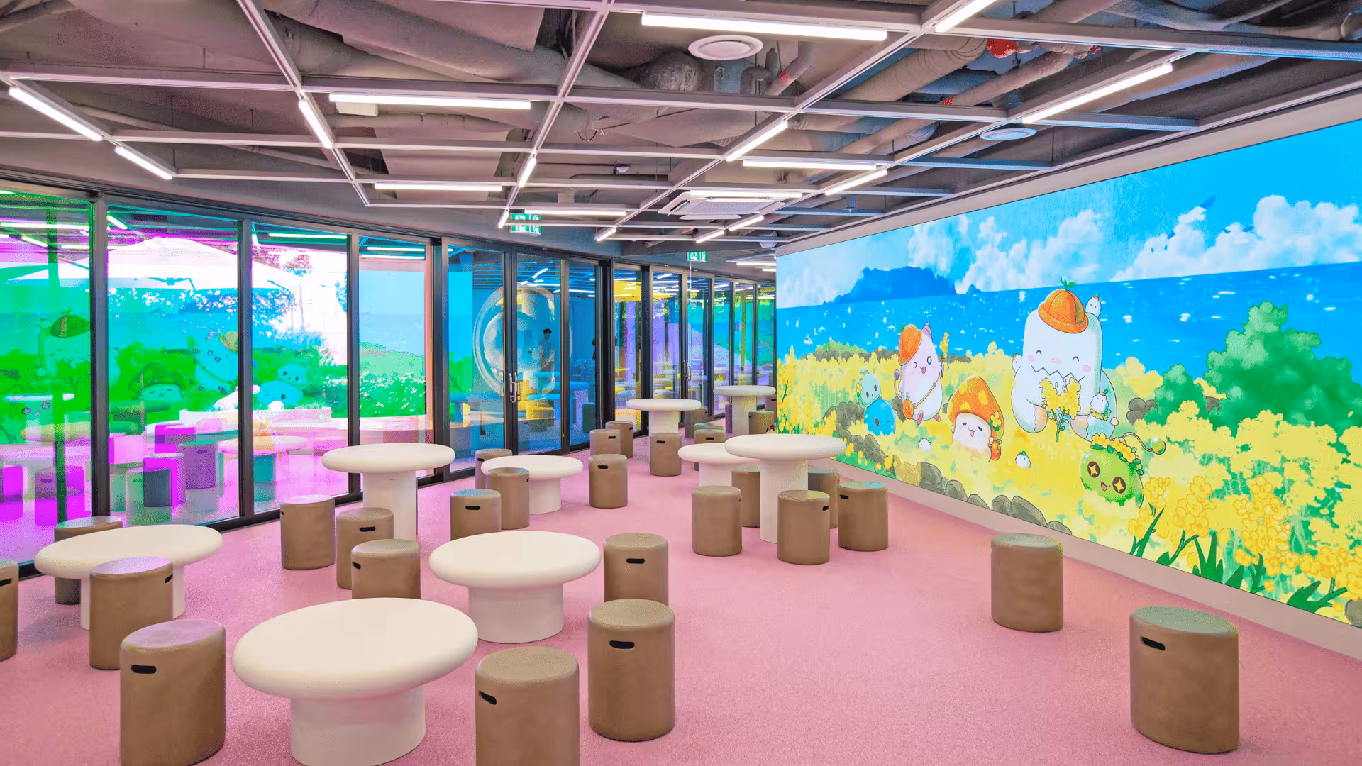 Los tonos suaves contrastan con detalles en madera y cemento, logrando un equilibrio entre lo fantástico y lo real. La iluminación, cuidadosamente pensada, refuerza la sensación de estar en un escenario interactivo donde cualquier cosa podría suceder. Y para los que buscan la foto perfecta para el recuerdo, la terraza alberga un elemento clave del universo MapleStory: la Mushroom House, ese rincón icónico que muchos jugadores reconocerán al instante.