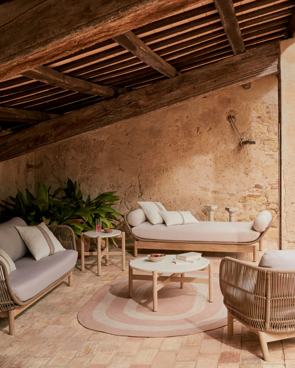 También puedes combinar distintos materiales: piedra en una pared, pintura en otra. En cuanto al suelo, las baldosas hidráulicas, el barro cocido o la madera maciza son aliados naturales del estilo. Si buscas más confort, añade una gran alfombra de fibras, que transmita calidez y vista con su textura.