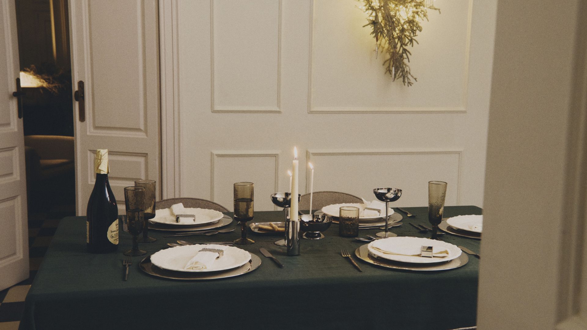 No hace falta montar una mesa recargada para añadir glamour. Una bandeja dorada, una vajilla con borde metálico, un jarrón con bolas navideñas o unos candelabros de latón elevan cualquier comida especial.