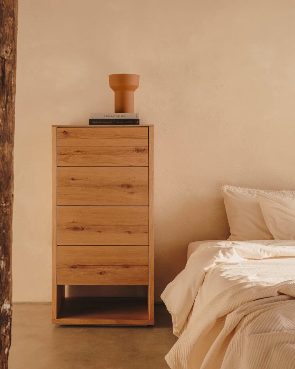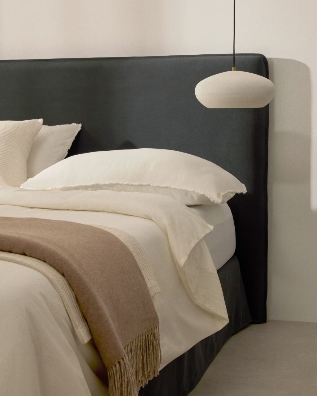 La cama marca el ritmo del dormitorio. Su posición condiciona todo lo demás y, por ello, merece una elección meditada. Siempre que sea posible, es recomendable apoyarla sobre una pared sólida y visible desde la entrada, evitando alinearla completamente con la puerta.