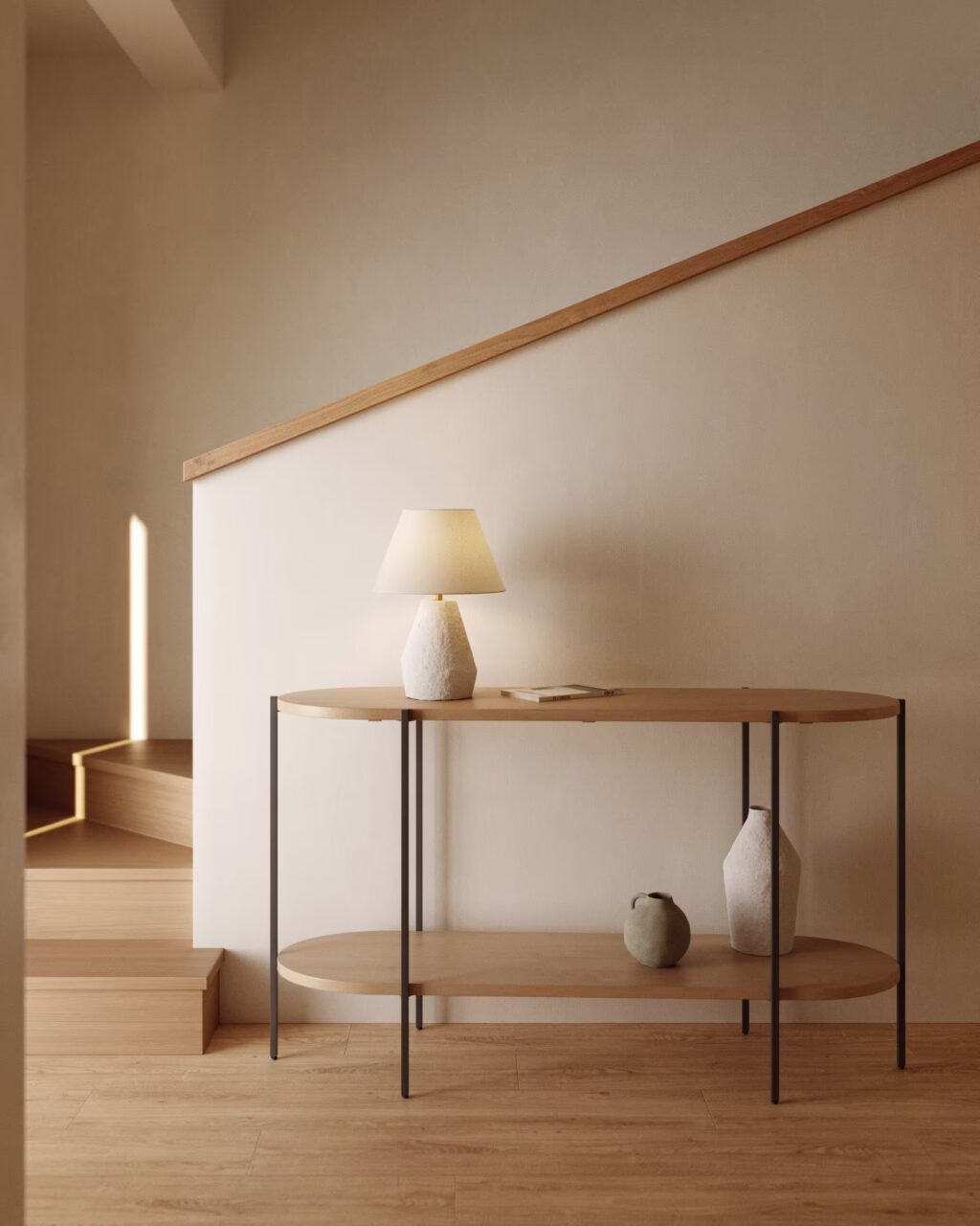 Si la estancia lo permite, una lámpara de mesa encima de una consola es ideal para decorar el recibidor sin ocupar mucho espacio. Nuestras favoritas son las lámparas de mesa con pantalla de tela: crean una luz suave y muy relajante. ¿Cómo? La pantalla tamiza la luz, lo que ayuda a generar una atmósfera cálida y acogedora, ideal para dar una bienvenida agradable al hogar.