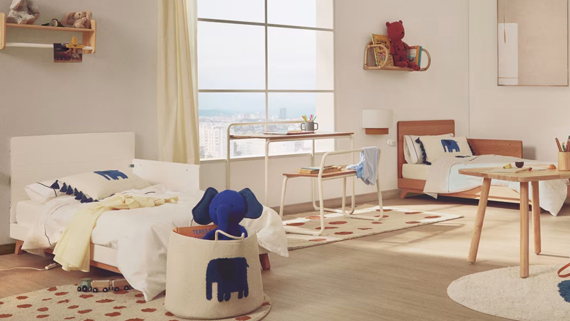 Acompaña la cama nido con una librería baja o una mesa plegable para que el espacio se adapte a distintas rutinas: dormir, estudiar o descansar.