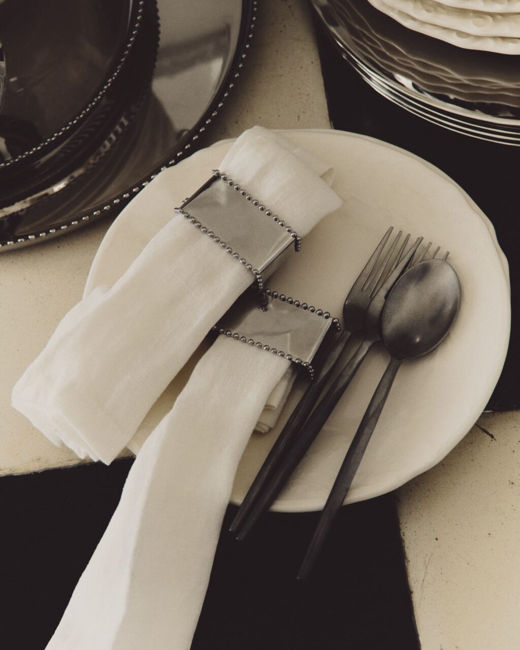 La mantelería verde de lino se convierte en el punto de partida. Su textura, natural y ligera, aporta profundidad y conecta con el espíritu mediterráneo: ese equilibrio entre lo rústico y lo refinado. Sobre ella, los platos de cerámica beige se presentan como piezas únicas, imperfectamente perfectas, que suman calidez y un gesto artesanal.