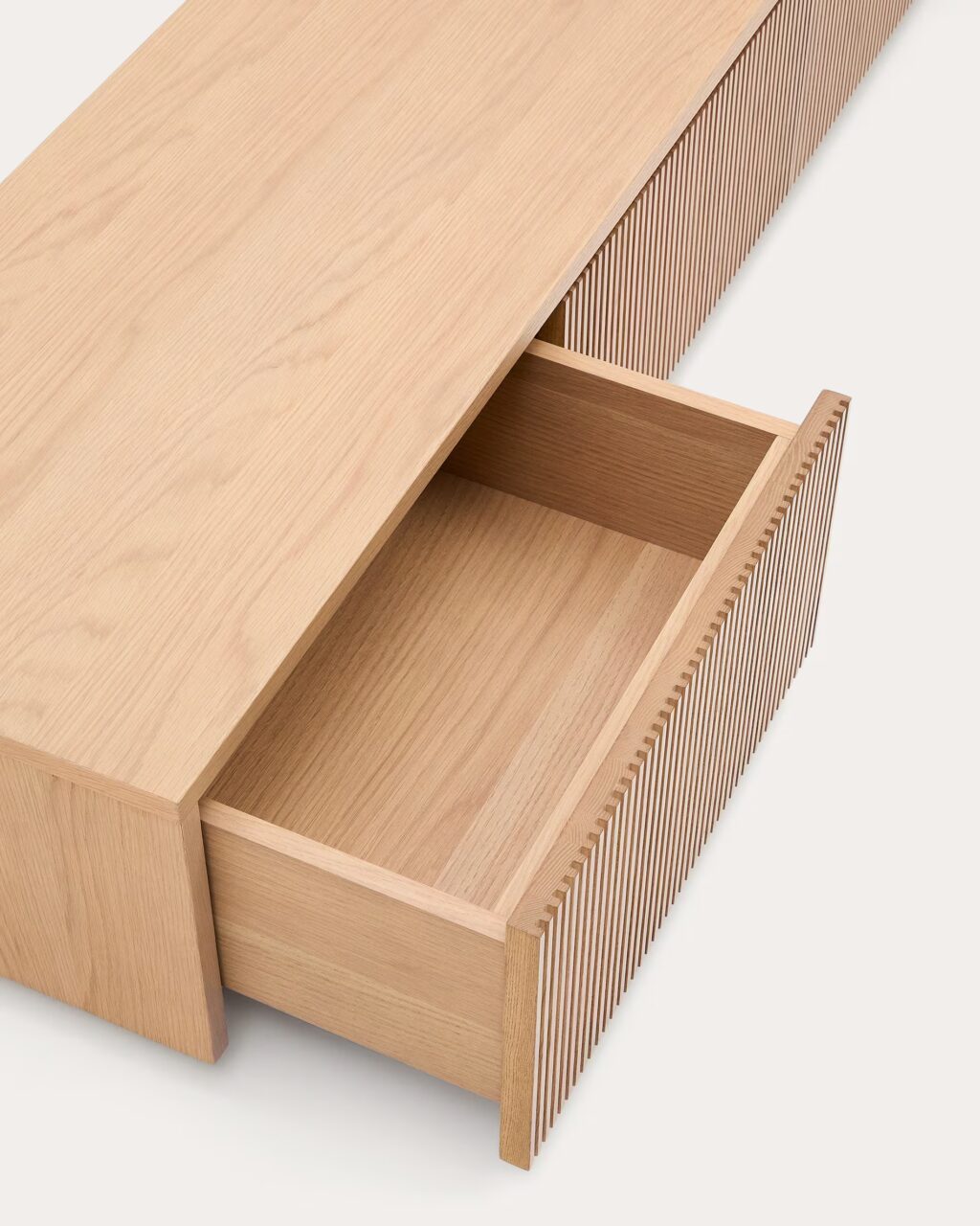 Hecho de chapa de roble, el mueble TV Helvine es una declaración de principios. Su diseño limpio y sereno aporta calidez a cualquier salón, mientras que los cuatro cajones con apertura a presión y guías ocultas regulables permiten mantener el orden con discreción y ligereza visual.