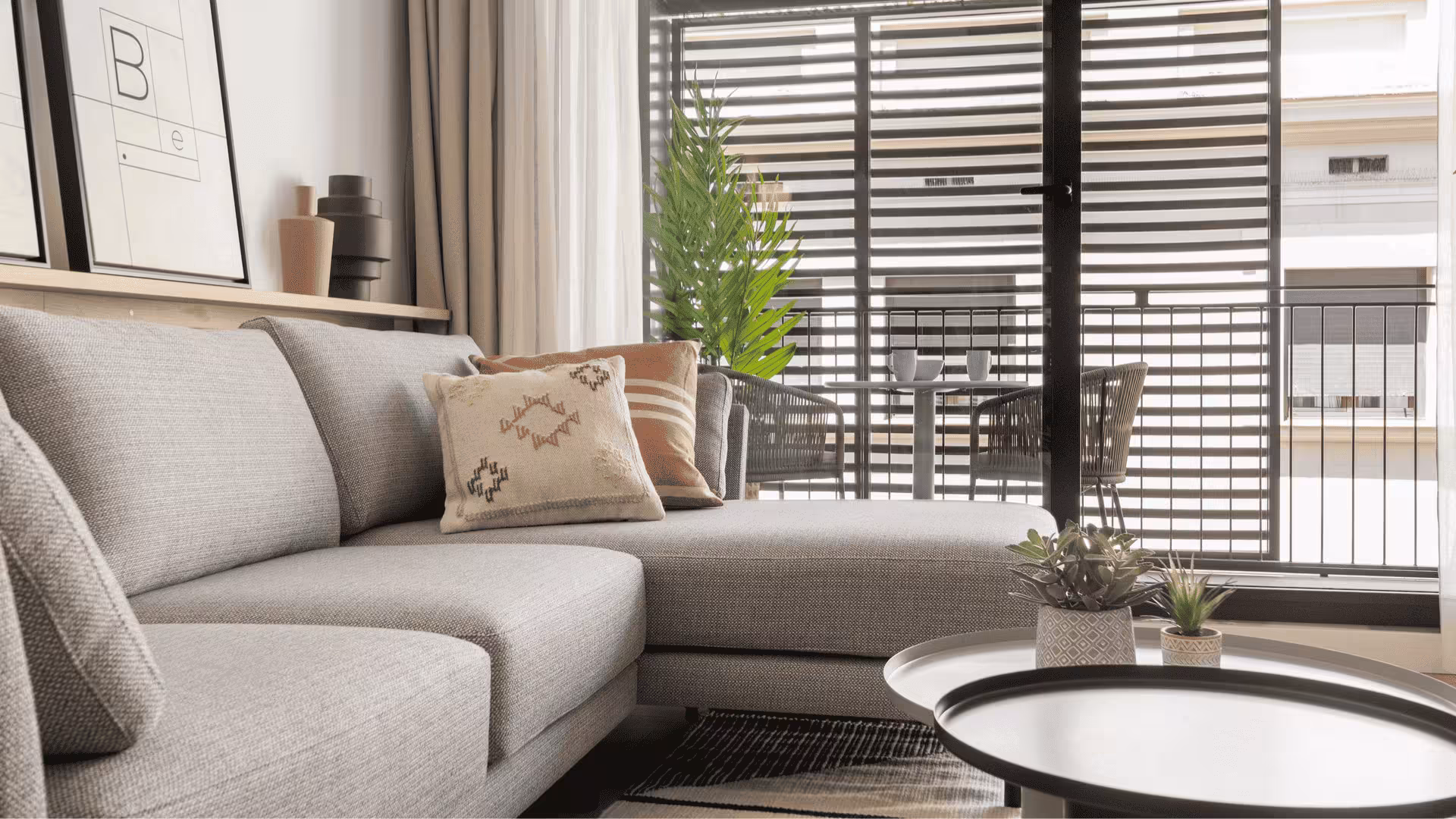 El salón es el mejor ejemplo. El sofá Gilma de tres plazas, con chaise longue y tapizado en chenilla perla, es la pieza protagonista porque invita a descansar entre reunión y reunión. Su diseño equilibrado se complementa a la perfección con el mueble de TV Licia, fabricado en madera maciza de mango con detalles en metal negro, que aporta estructura y carácter. La mesa auxiliar redonda Fleksa, también de metal negro, y el jarrón Velia, en beige pintado, completan un espacio pensado para relajarse o trabajar con comodidad. Gracia es un barrio donde las ideas y las culturas fluyen, y este salón refleja esa energía, equilibrando tonos neutros y materiales nobles.