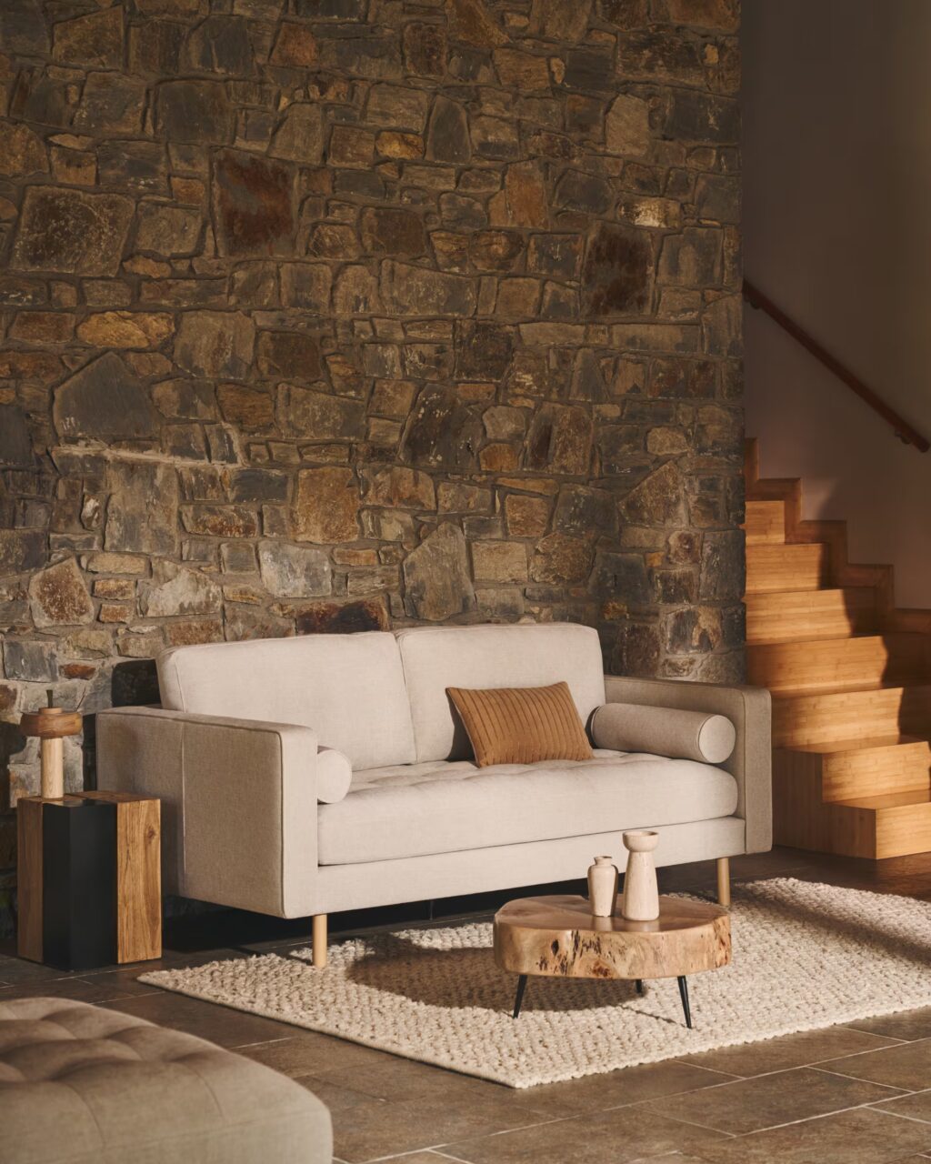 Los cojines del respaldo son desenfundables y están rellenos de fibra y espuma picada, garantizando esa sensación envolvente que se agradece después de un día largo. Su estructura interna combina madera maciza de pino y contrachapado, garantizando un mueble duradero. Laira es ese sofá que resuelve, acompaña y se adapta a cada momento de la vida en casa.