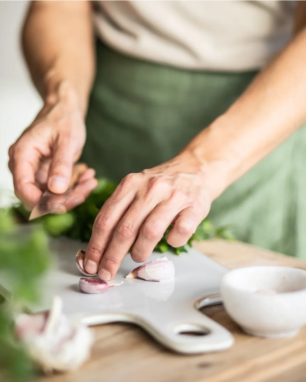 - Prepara la base aromática: pica un diente de ajo y dóralo a fuego suave en una sartén amplia con el aceite de oliva.