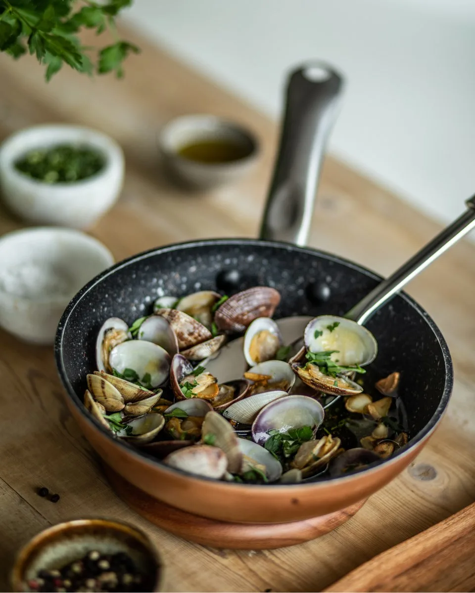 - Cocina las almejas: añade las almejas escurridas y un poco de pimienta negra. Si quieres, incorpora un chorrito de vino blanco. Tapa la sartén y deja que se abran.