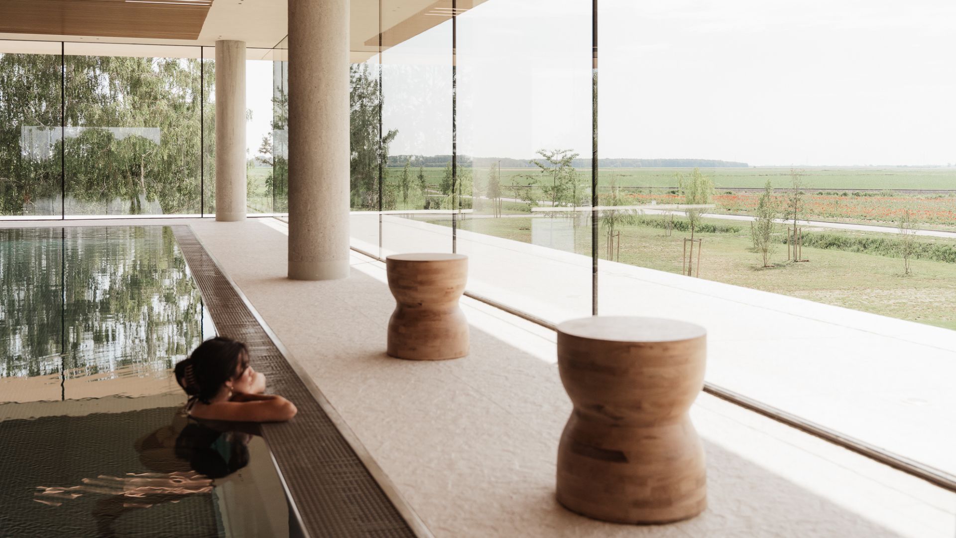 Las habitaciones combinan materiales nobles y tonos tierra que reflejan la naturaleza circundante. No hay excesos ni elementos superfluos, solo piezas bien elegidas que crean un ambiente sereno. Y si los campos de trigo y amapolas que rodean el hotel no fueran suficiente inspiración, siempre queda la opción de hundirse en una butaca cómoda y dejarse llevar por la calma.