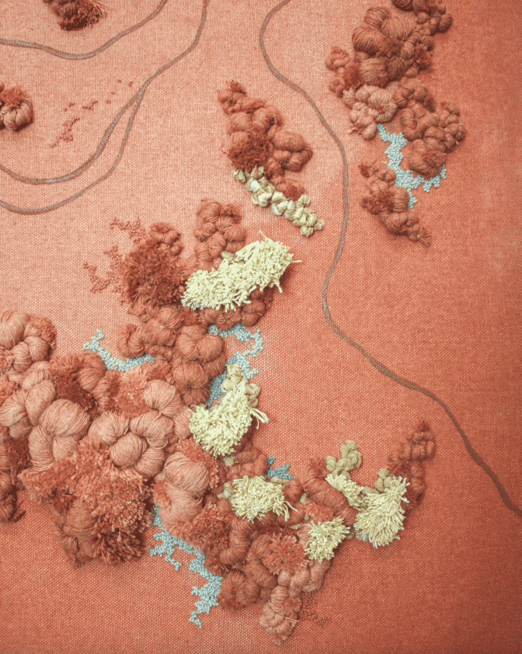 En su estudio, el proceso comienza siempre por la elección del material. Trabaja sobre lienzos de algodón y mezcla técnicas textiles como bordado, aplicación de materiales y tejido manual. Experimenta con capas, densidades y relieves para crear piezas que invitan a mirar de cerca. “Me gusta probar nuevas maneras de aplicar las técnicas tradicionales o combinarlas con materiales diferentes”, cuenta.
