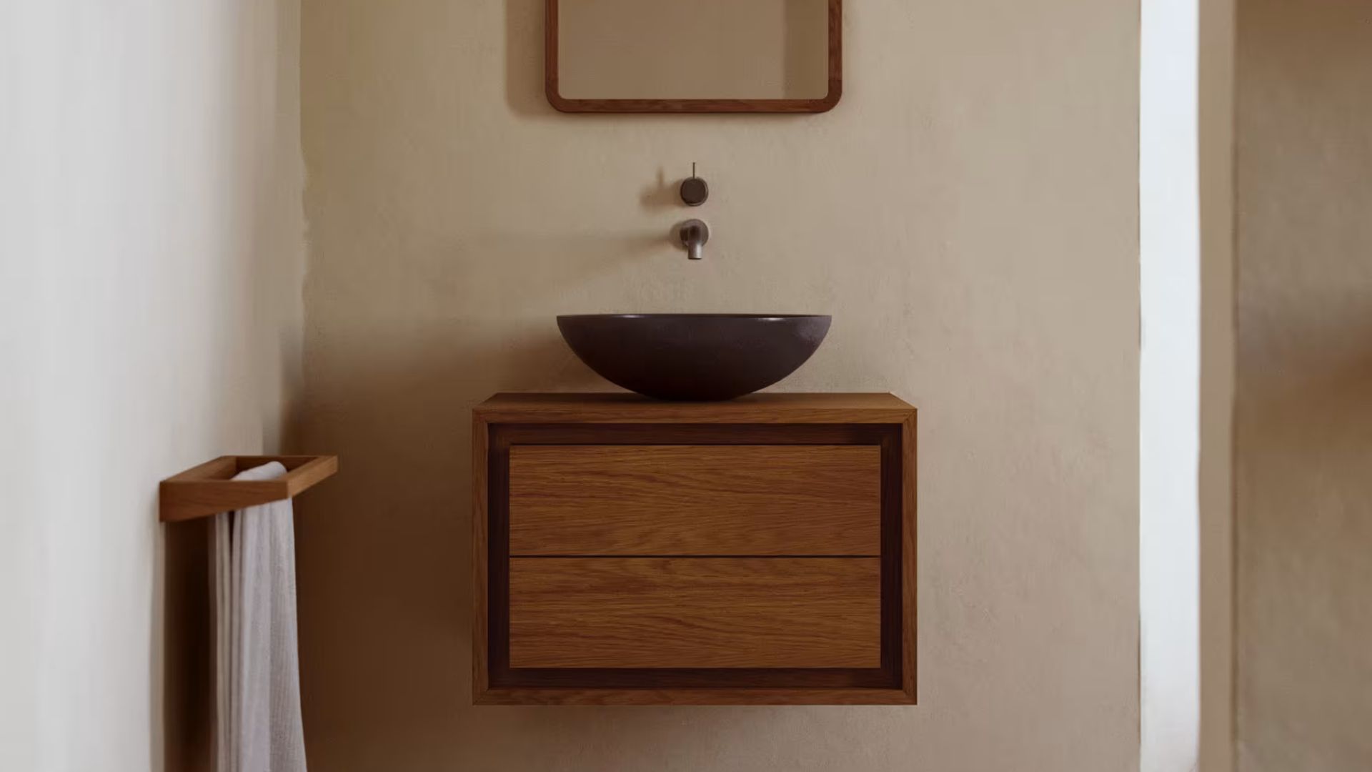 El acabado oscuro de la teca aporta profundidad y combina muy bien con lavabos de piedra, grifería en tonos oscuros o textiles en gamas neutras. Kenta es una pieza que hace que el baño pequeño se sienta más cálido y personal.