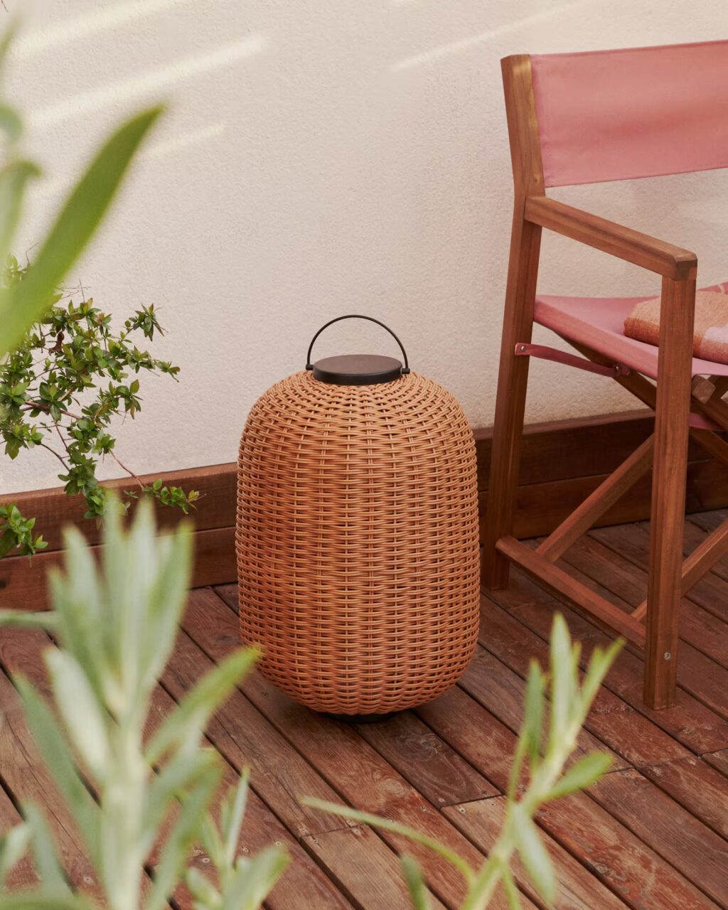 Al caer la tarde, la iluminación cálida transforma el patio en un lugar íntimo. Guirnaldas discretas, faroles, lámparas solares o apliques de pared dibujan una escena serena que invita a permanecer.