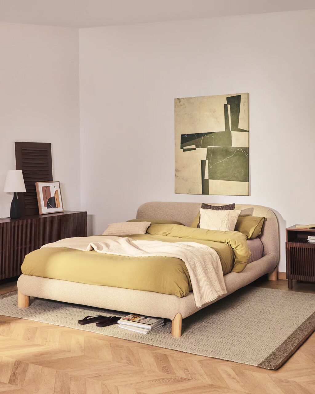También veremos cabeceros con presencia escultórica —tapizados en lana, terciopelo o tejidos bouclé— y bancos al pie de la cama con mucha calidez, orden y estilo.