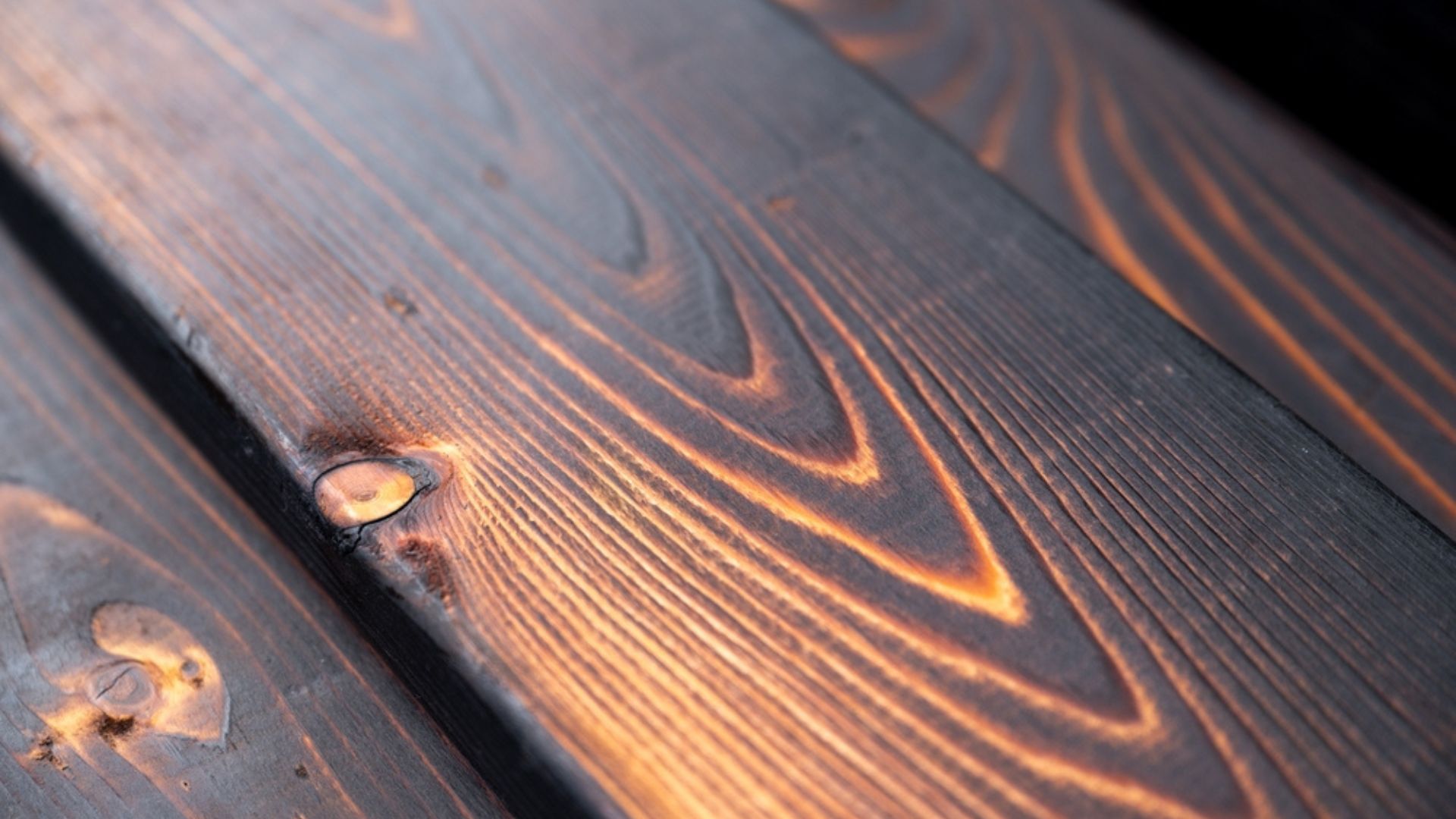El resultado es una madera de apariencia única, con reflejos metálicos, textura suave al tacto y una superficie que, paradójicamente, se vuelve más resistente cuanto más se quema.